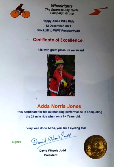 th December 2021. It was a mild but murky day with drizzle which cleared later. Despite this a motley crowd of over 25, many in festive attire, took part and cycled along NCR 4 from Blackpill to the Wetlands Centre at Penclacwydd and back. Read about it in the following two accounts: